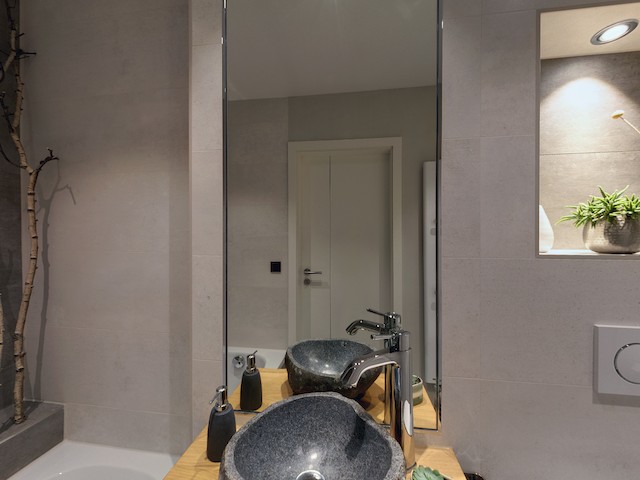 Der Waschtisch aus Naturstein und Echtholz lässt einen Besucher beim Eintreten die Natur spüren. Später wird er feststellen, dass die Badewanne trotz kompakter Größe uneingeschränktes Badevergnügen bietet, was durch ein paar Extrazentimeter in der Höhe erzielt wurde.