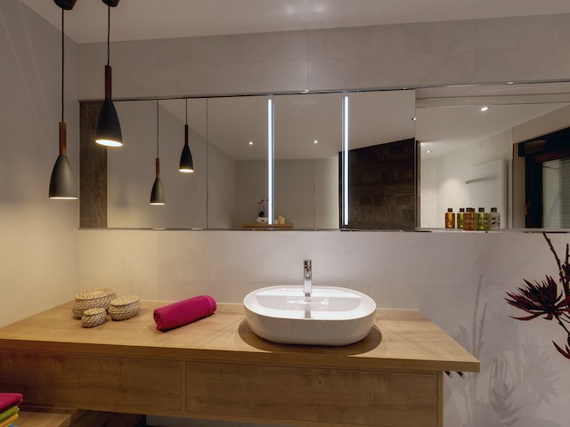 Die Holzmöbel und der Spiegelschrank in Trockenbau-Vorsatzschale werden durch die wohnliche Beleuchtung perfekt in Szene gesetzt. Eine passende Ergänzung bildet die freistehende Trennwand zur Dusche, die das große Bad zusätzlich indirekt mit kühlerem Licht versorgt.
