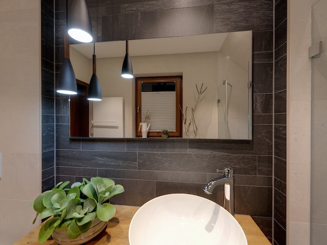 Dieses Naturbad wird seinem Namen durch natürliche Oberflächengestaltung, Fliesen in Beton- und Schieferoptik sowie einer Waschtischanlage aus Echtholz mehr als gerecht. Die kleine Dachschräge in der Dusche bricht die Formsymmetrie zwischen Eingangs- und Duschbereich und schafft so mehr Abwechslung, ohne zu stören.